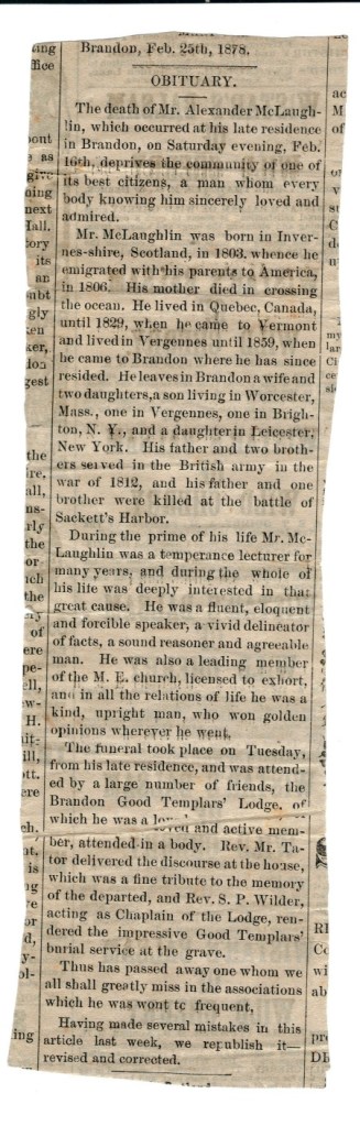 Mary Helena’s mother was Sophia MacLaughlin from Brandon, Vermont. Mary Helena’s grandparents were Alexander MacLaughlin and Ann Elliott (no relation to Mary Helena’s Dad, we think – note the spelling) who immigrated to the US from Inverness (Scotland) in the early 1800s. Below is Alexander McLaughlin’s obituary from 1878.