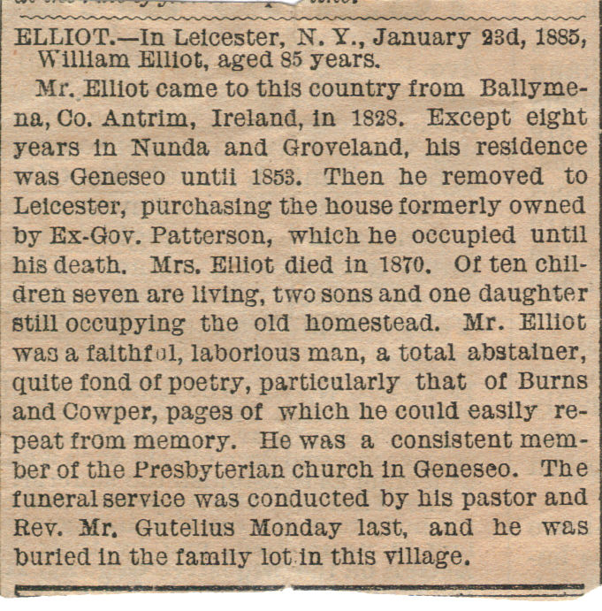 John Elliot (Mary Helena’s Father) was William Elliot, William was married to Jane McLain – Henry’s aunt. Both he and Jane were immigrants to the USA and came from County Antrim in Northern Ireland. Below is William Elliot’s obituary.