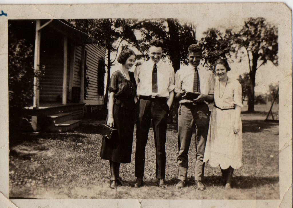 Elliot married Mabel Irene Nichols (b.1891) in 1920 when he was 25 and she was 29. Here is a picture of Elliot and Mabel with Elliot’s younger brother Leigh (b.1900) and his future wife Lillis Albertine Howard in 1918, presumably at Henry McLain’s house.