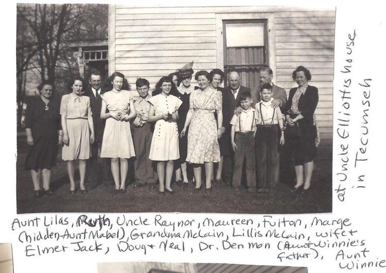 McLain gang (L to R) Henry McLain, Lilas McLain, Raynor McLain, Fulton McLain III (Raynor holding), Maureen McLain, Stuart McLain, Muriel McLain, Winnie McLain, Ruth McLain, Lillis McLain, Marjorie McLain (Lillis Holding) Elliot McLain, Mabe McLain, Howard McLain and Mary Helena McLainFamily reunion at Elliot’s House in Tecumseh.Top LtoR: Raynor McLain, Elliot McLain, Mary Helena McLain, Stuart McLain, Mabel Nichols McLain, Lillis McLain, Maureen McLain, Marjorie McLain, Winnie McLain, Lilas McLain, Bob McLain. Bottom LtoR: Fulton McLain (IV), Howard McLain, Neal McLain, Doug McLain, Ruth McLain Strange, Robert Strange and Shelby Strange