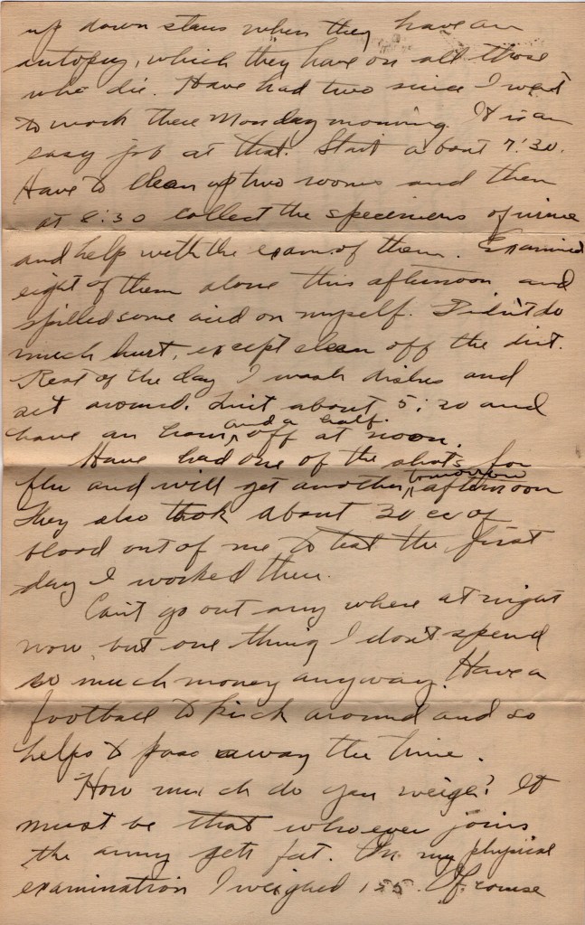 (page 2 see left) up downstairs when they have an autopsy, which they have on all those who die. Have had two sicne I went to work there Monday morning. It is an easy job at that. Start about 7:30. Have to clean up two rooms and than at 8:30 collect the specimens of urine and help with the exam of them. Examined eight of them alone this afternoon and spilled some acid on myself. DIdin’t do much hurt, except to clean off the dirt. I was dishes and sit around. Quit about 5:30 and have an hour and a half off at noon.