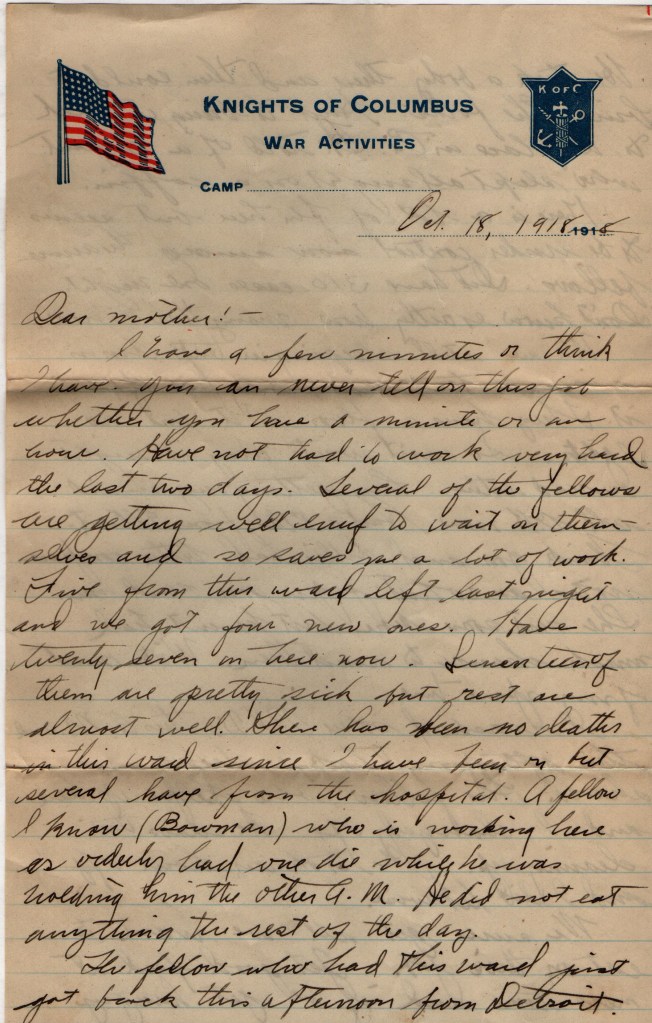 I have a few moments to write or I think I have. You can never tell on this job whether you have a minute or an hour. Have not had to work very hard the last two days. Several of the fellows are getting well enuf to wait on themselves and so saves me a lot of work. Five from this ward left last night and we got four new ones. Have twenty seven here now. Seventeen of them are pretty sick but the rest are almost well. There has been no deaths in this ward since I have been in but several have from the hospital. A fellow I know (Bowman) who is working here as orderly had one die while he was holding him the other A.M. He did not eat anything the rest of the day.