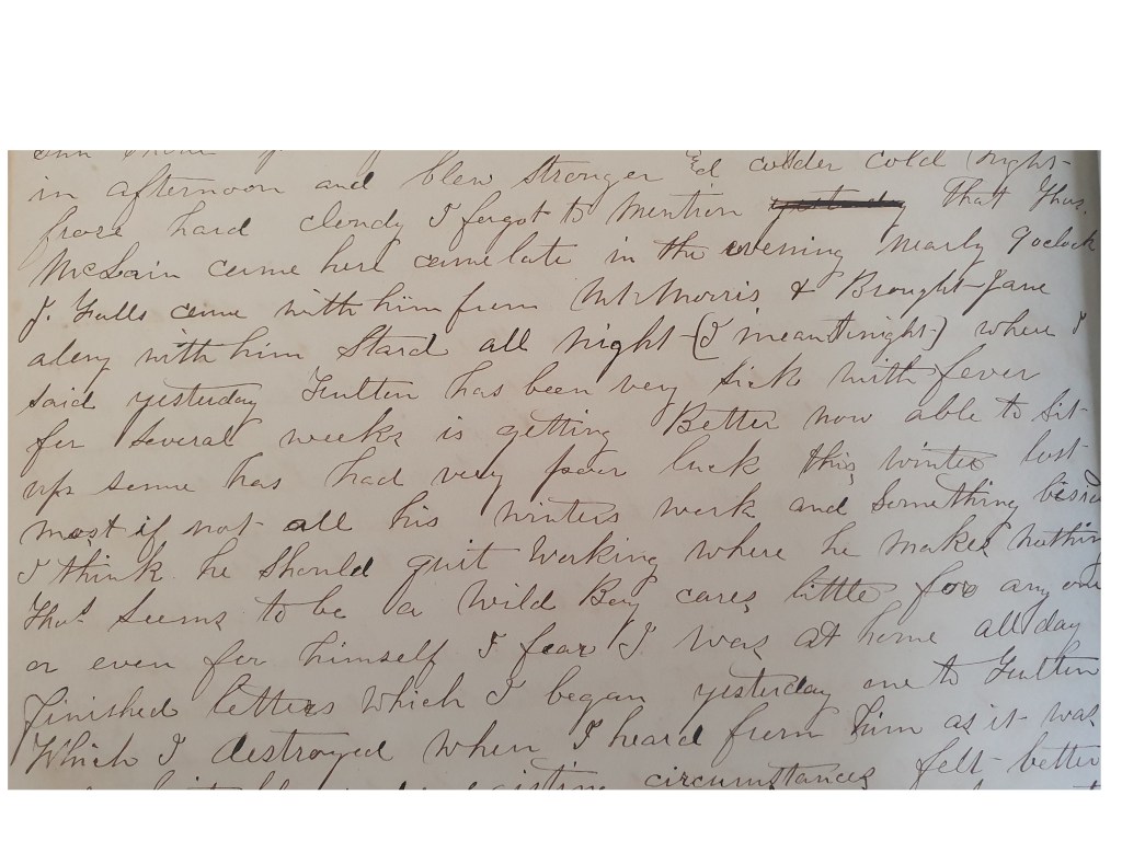 I forgot to mention that Thos (???) McLain came here late in the evening nearly 9 o’clock. J Halls came with him from Mt Morris (???) and brought Jane along with him. Staid all night (I meant night) where I said yesterday Fulton has been very sick with fever for several weeks, is getting better now able to sit up some, has had very poor luck this winter, lost most if not all his winter’s work and something besides. I think he should quit working where he makes nothing. Thos seems to be a Wild Boy, cares little for anyone or even for himself I fear. I was at home all day, finished letters which I began yesterday. One to Fulton which I destroyed when I heard from him as it was not suitable under the existing circumstances.